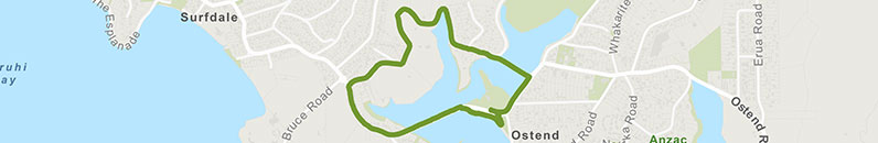 Start at the car park of the Sports Club, next to the tennis courts along the Causeway, Ostend. In the mornings this is a popular coffee and juice spot with the locals. Head towards Wharf Road on the shared path – this route is for walkers and cyclists. You’ll get good views of the Okahuiti Wetland here. Turn left onto the scenic gravel causeway and cross the Okahuiti Creek – watch the tide rushing in and out and spot the wildlife in the mangroves. At Wilma Road turn left and wind your way along the original main road between Ostend and Surfdale, which is now very quiet. A gentle climb takes you all the way up to Causeway Road, where you turn left onto the shared path and zoom down to the start. Use your brakes – there are hidden corners and driveways along here, so don’t go to fast! On your way down you could cross the busy road and visit stunning Goldie Vineyard for lunch, but check their opening hours.