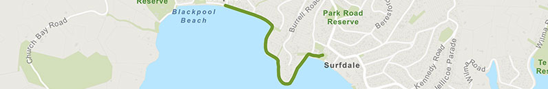 Start at the bottom of Moa Avenue, by the swings. Follow the gravel Esplanade route along the beach and around the headland until you reach Surfdale Beach.