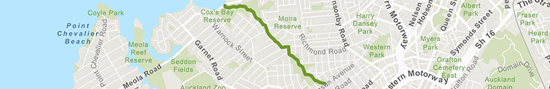 A newly developed safe walking and cycling route from Grey Lynn Park to Coxs Bay Reserve.
