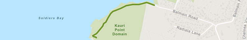 Follow the path through Kauri Point Domain, along the edge of coastal bush featuring kauri trees. The walk offers great views over the Upper Waitematā Harbour.