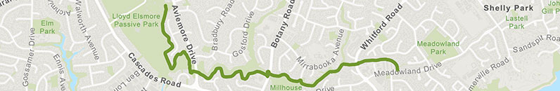 Along the path you will pass a playground located opposite 60 Gosford Drive and Millhouse Park, which has toilets and a basketball hoop. Bike parking is located near the bus stop.
