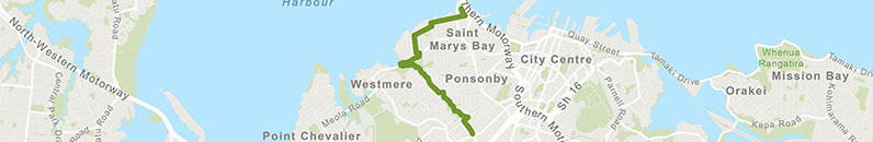 This ride takes you on sealed paths, through parks and along local streets. It starts on the "Grey Lynn Greenway" and it is a good option if you are with kids who are getting more confident on bikes. From the end of the Grey Lynn Greenway to Pt Erin is all on the road, without cycle lanes. The route shown avoids the busiest roads.